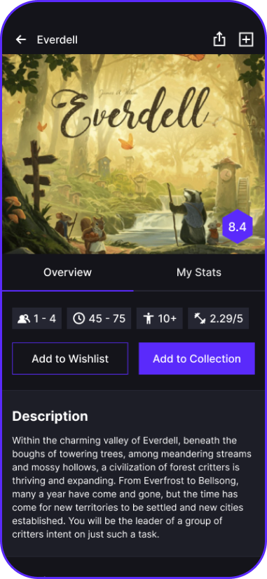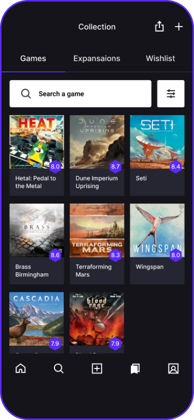 Build and showcase your personal board game library. Organize your base games, expansions, and wishlists, and see what your friends are collecting too.